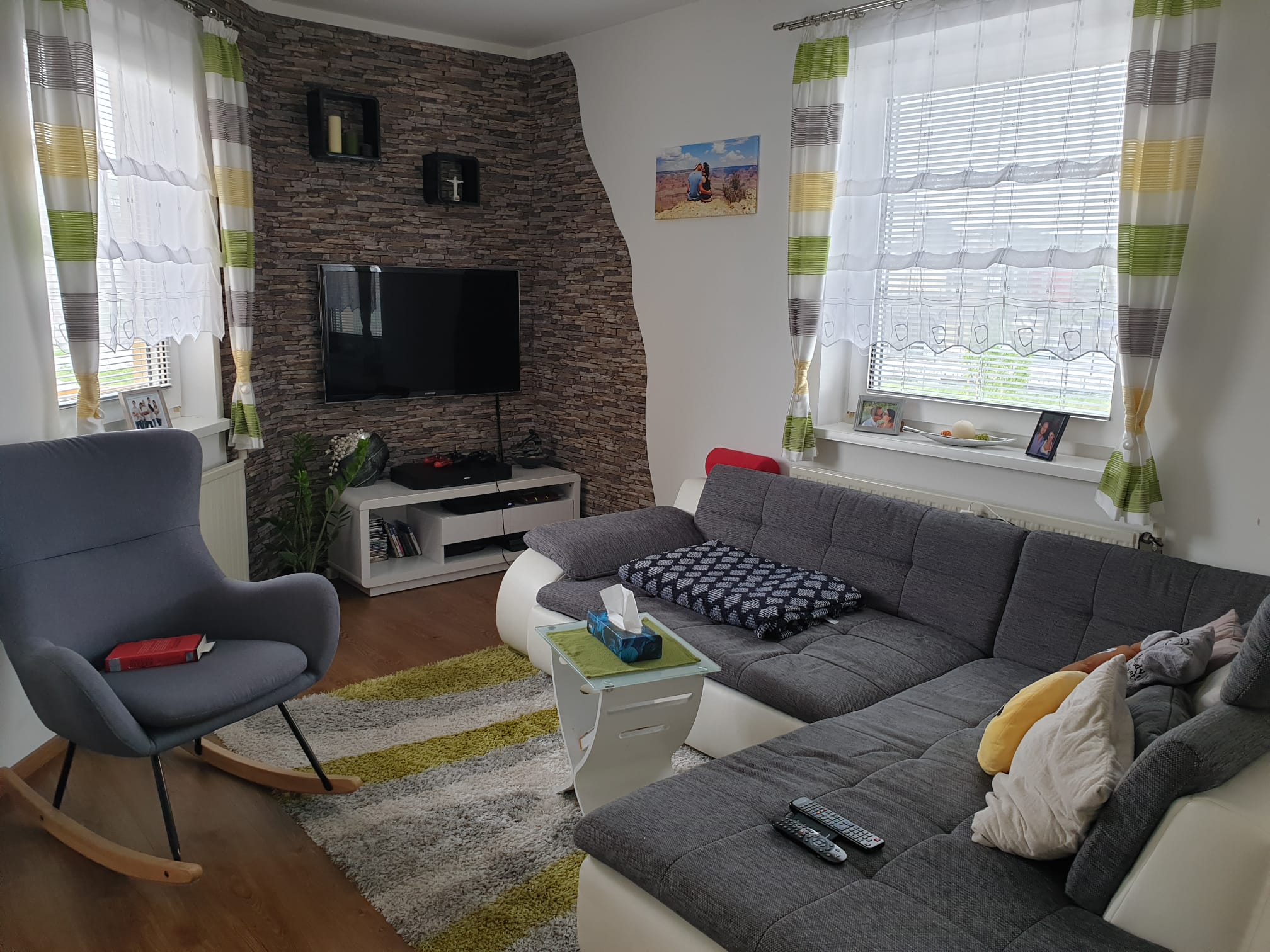 * Raumaufteilung: Wohnzimmer, Schlafzimmer, Kinderzimmer (oder Büro), Küche, Badezimmer, separates WC